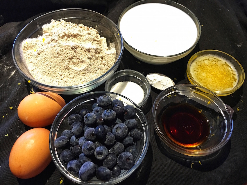 Combine all dry ingredients and mix together in a large bowl, then set aside. In a small separate bowl, whisk egg yolks into your buttermilk*, then add melted room temperature butter, vanilla and lemon zest.