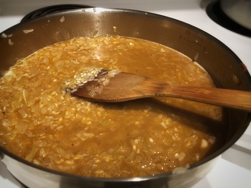 Once your rice is translucent, add your tomato sauce and warm stock, and mix well; make sure you do not have any rice sticking (and burning) on the bottom. Bring the liquid to a boil then lower the heat, cover and cook for 20-25 minutes.