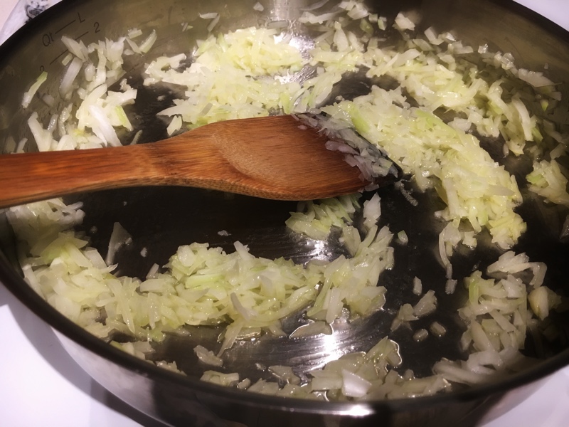 1. Heat large skillet over medium heat, add olive oil and allow to warm up for about 30 seconds then add onions and fry until soft and translucent.