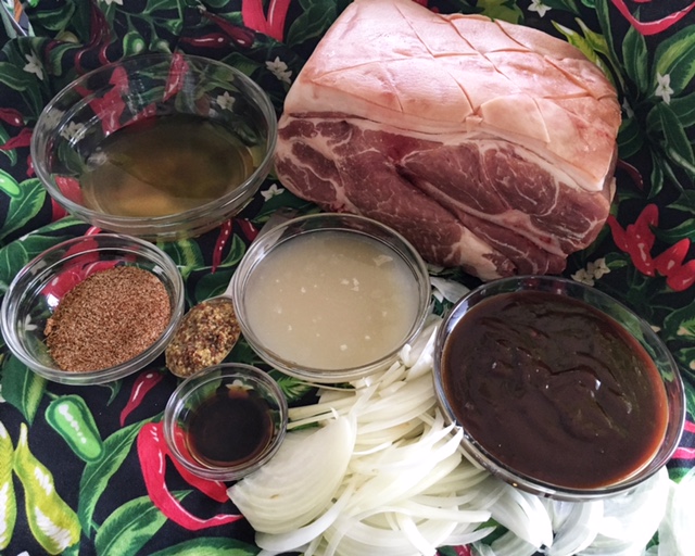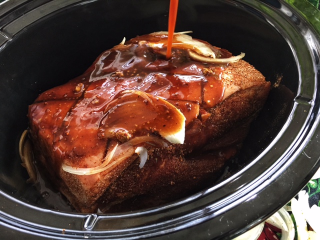 So the last step is pretty simple, place your pork into your slow cooker basin, pour your sauce over the pork, top generously with some chopped onions, turn your slow cooker on low for 8 hours and leave it covered!!!!!!